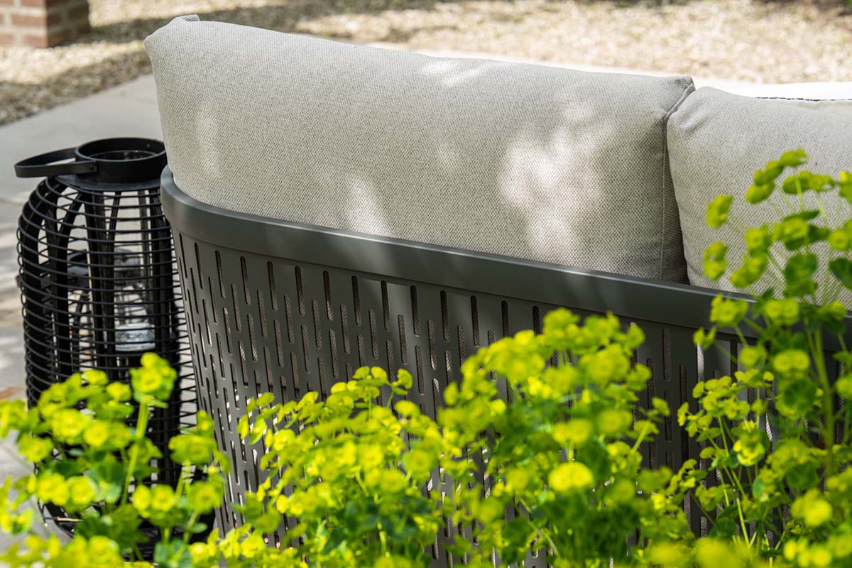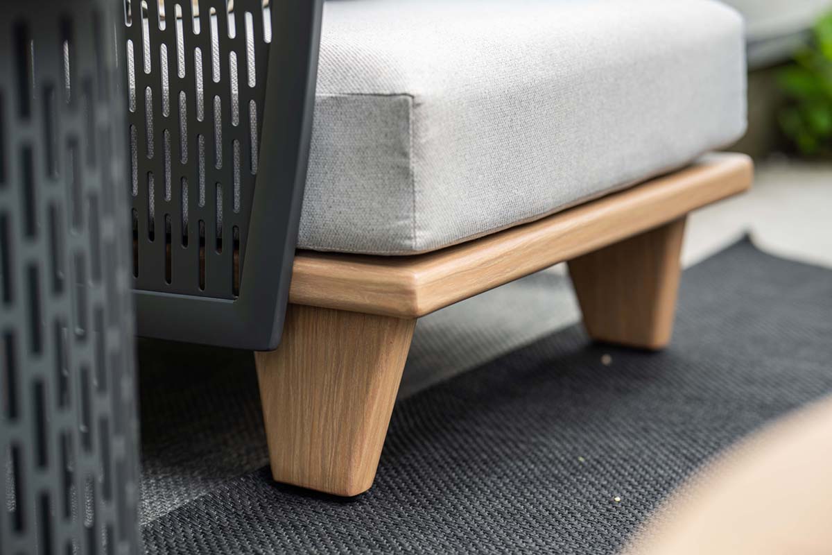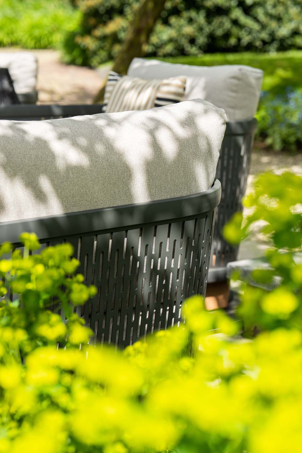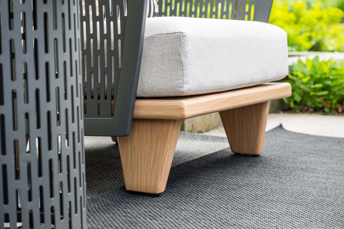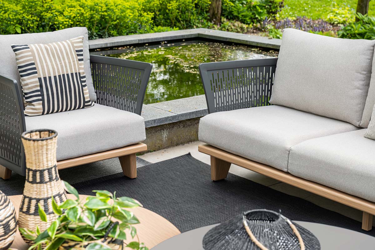 De loungeset is volledig gemaakt van gepoedercoat aluminium. Het onderstel van de bank en fauteuils heeft de uitstraling van teakhout, maar is toch gemaakt van aluminium. De tafels hebben verschillende afmetingen, hierdoor kun je de set in meerdere opstellingen plaatsen en zo spelen met de indeling. Luxe kussens zijn gemaakt van betoverend mooie bouclé stof. Hierdoor voelen de kussens prettig pluche aan, wat de set een unieke uitstraling geeft. De kussens zijn waterafstotend, waardoor je eenvoudig een paar druppels regen van de set afschudt. Als er slecht weer wordt voorspeld, raden wij aan de kussens op een warme en droge plaats te bewaren.