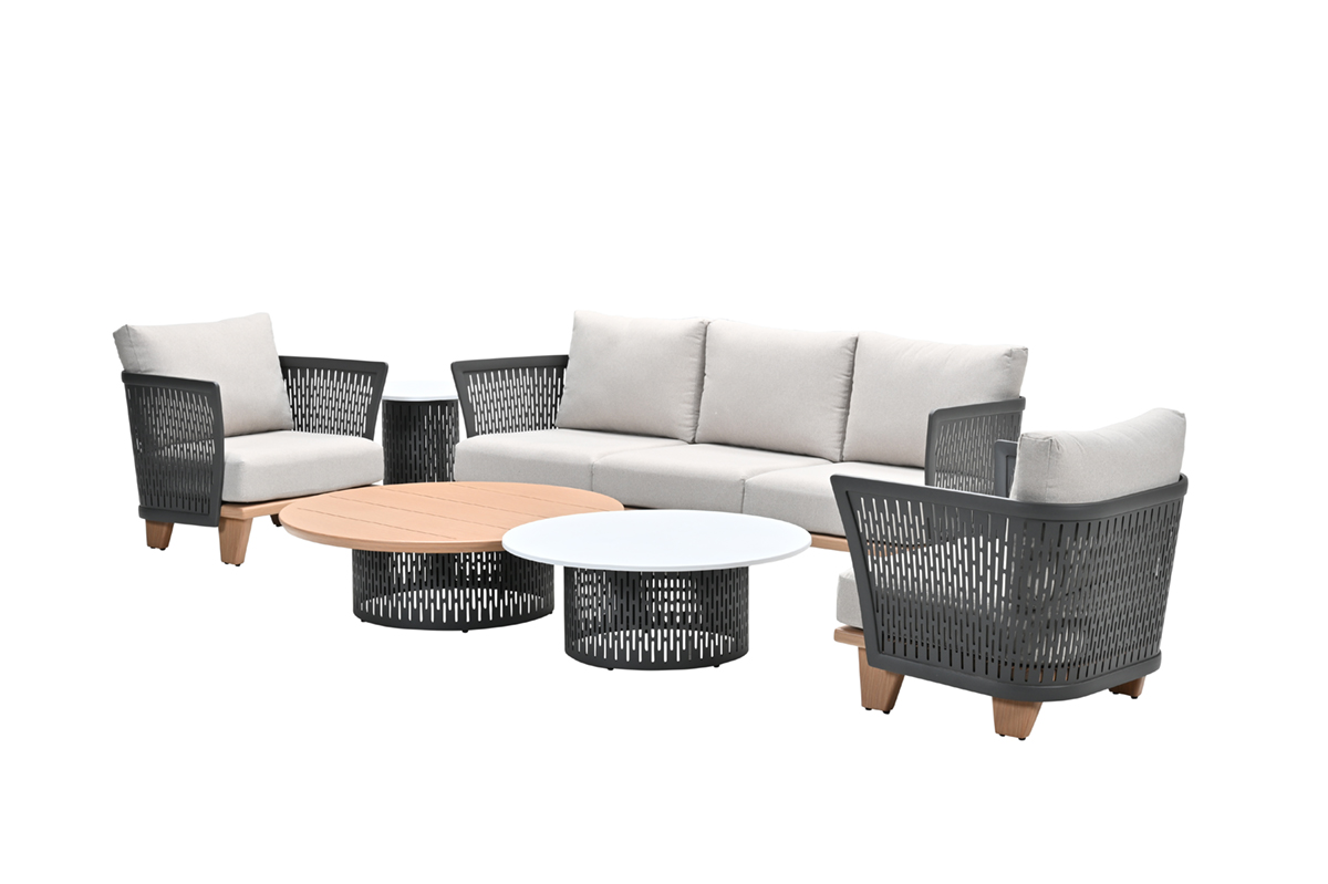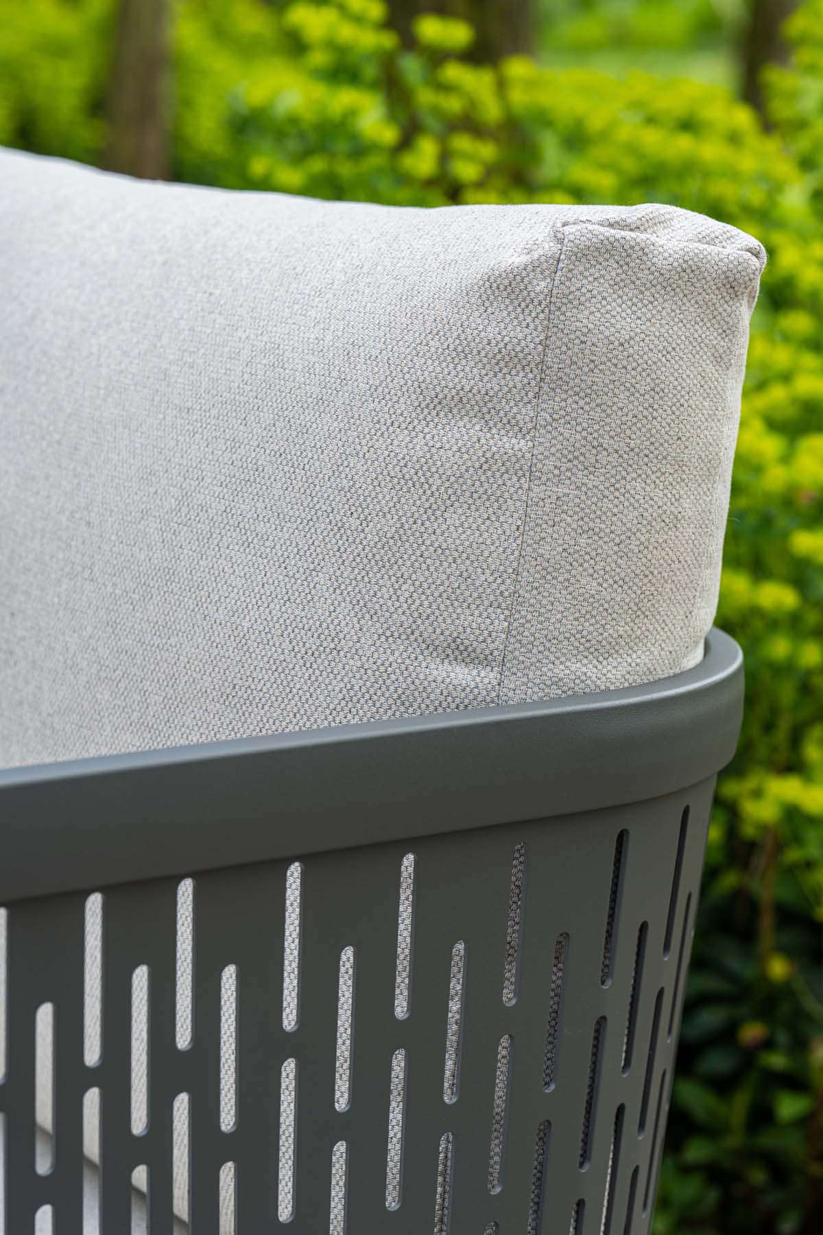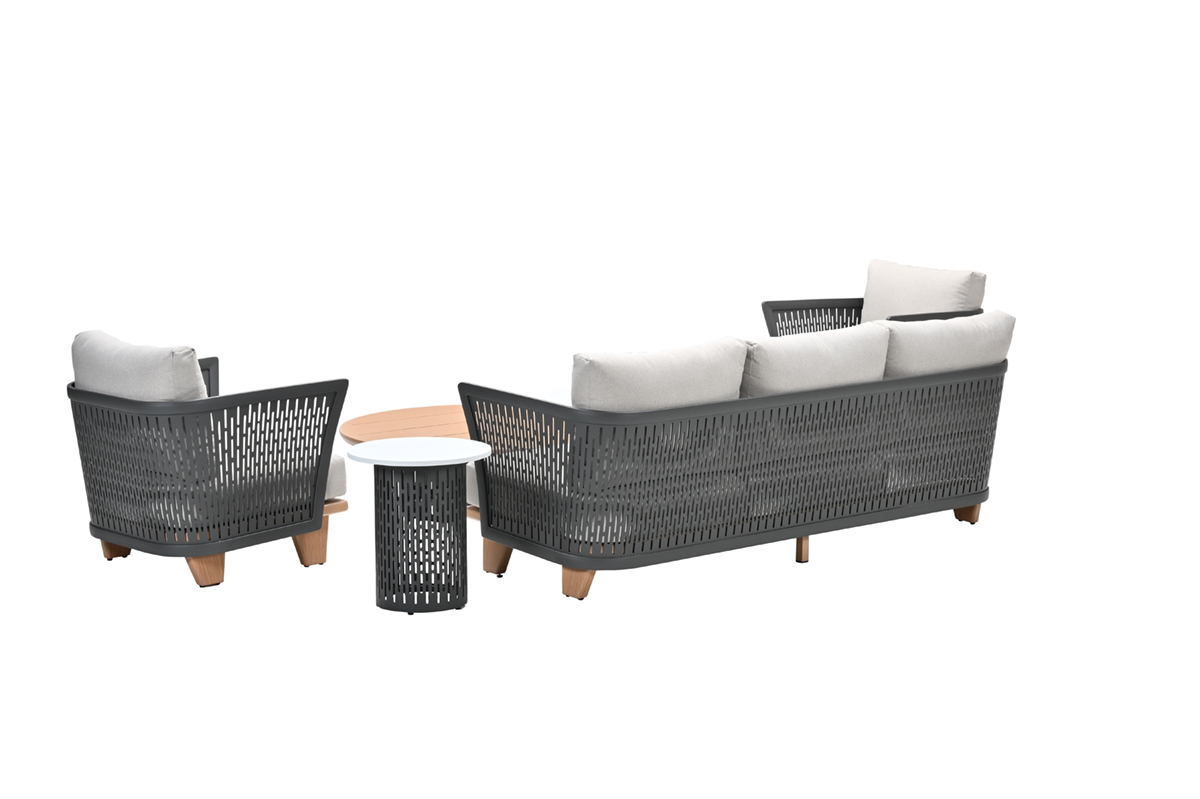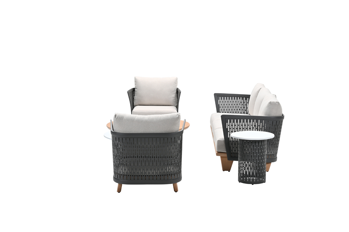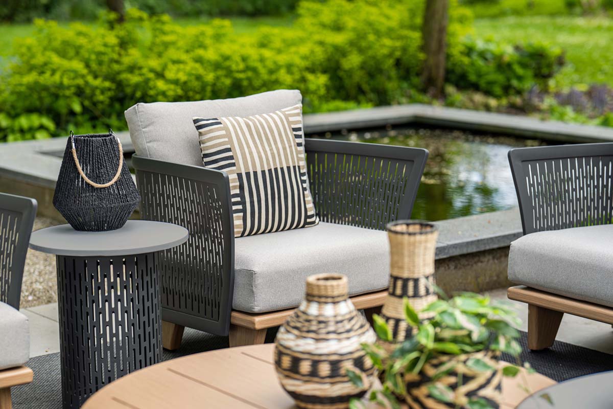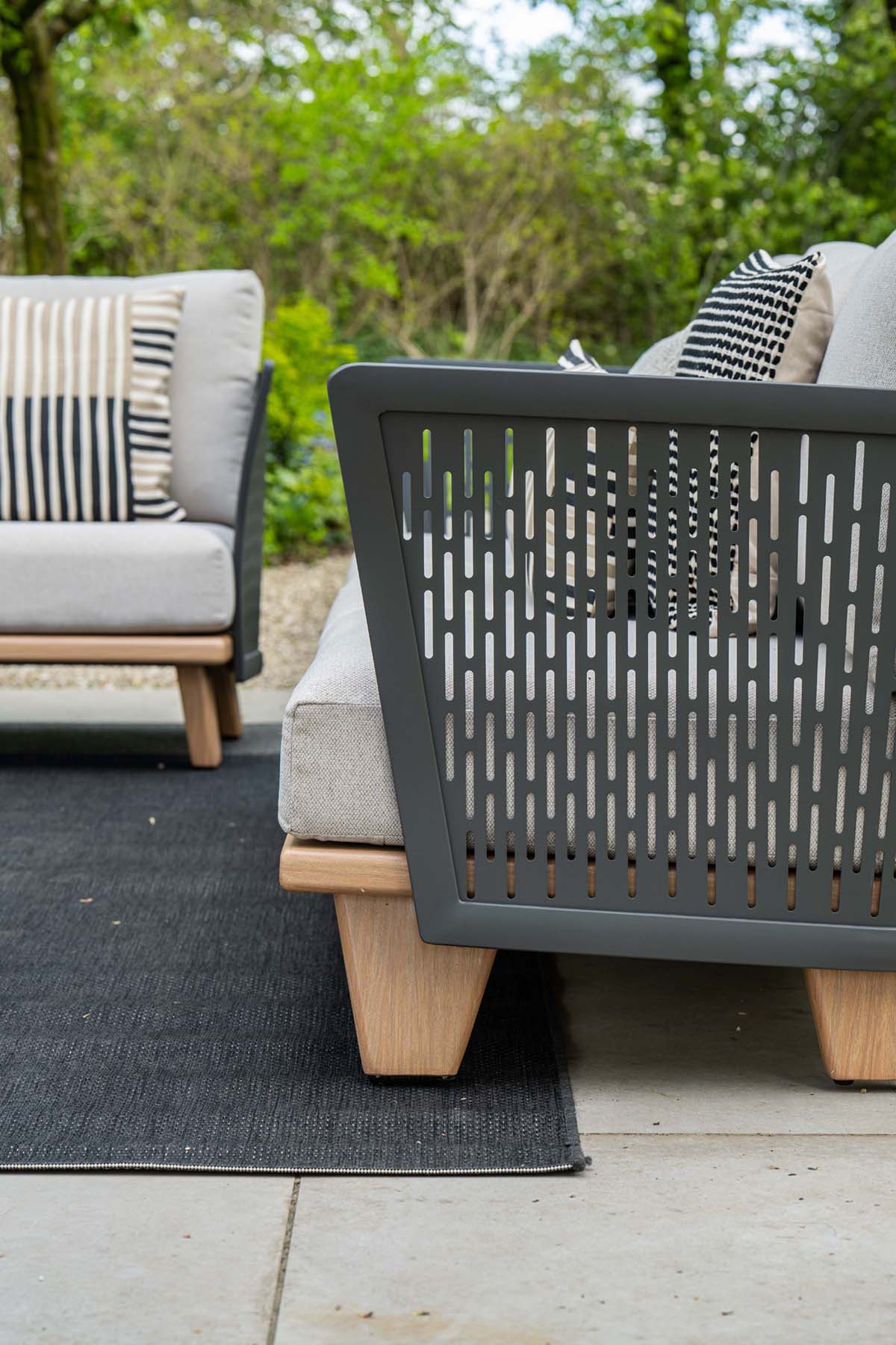 De loungeset is volledig gemaakt van gepoedercoat aluminium. Het onderstel van de bank en fauteuils heeft de uitstraling van teakhout, maar is toch gemaakt van aluminium. De tafels hebben verschillende afmetingen, hierdoor kun je de set in meerdere opstellingen plaatsen en zo spelen met de indeling. Luxe kussens zijn gemaakt van betoverend mooie bouclé stof. Hierdoor voelen de kussens prettig pluche aan, wat de set een unieke uitstraling geeft. De kussens zijn waterafstotend, waardoor je eenvoudig een paar druppels regen van de set afschudt. Als er slecht weer wordt voorspeld, raden wij aan de kussens op een warme en droge plaats te bewaren.