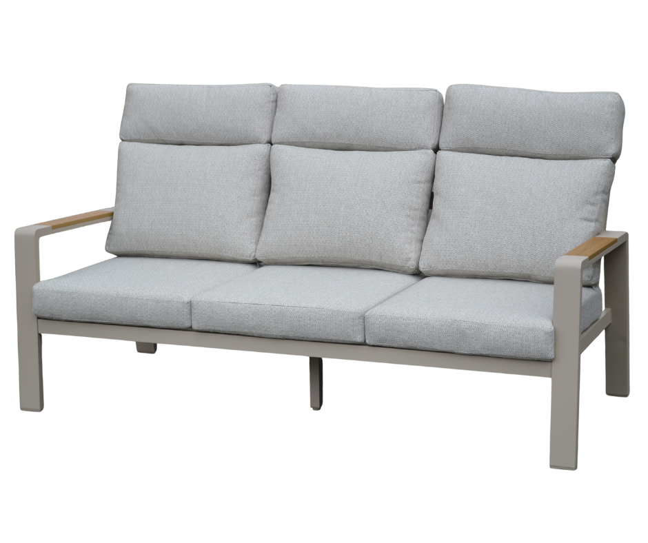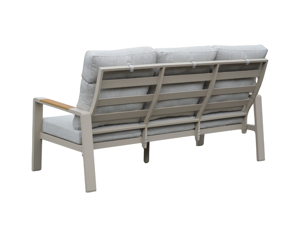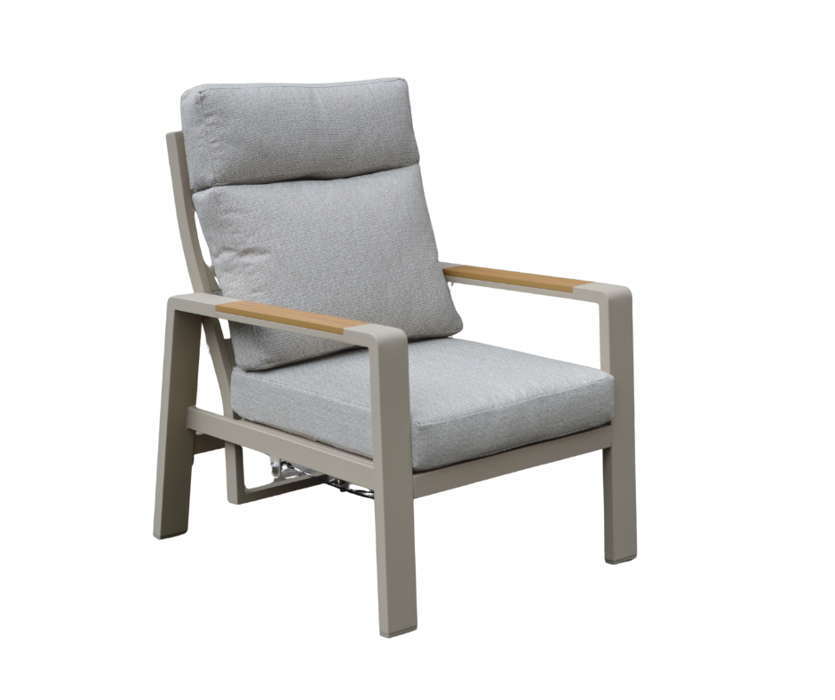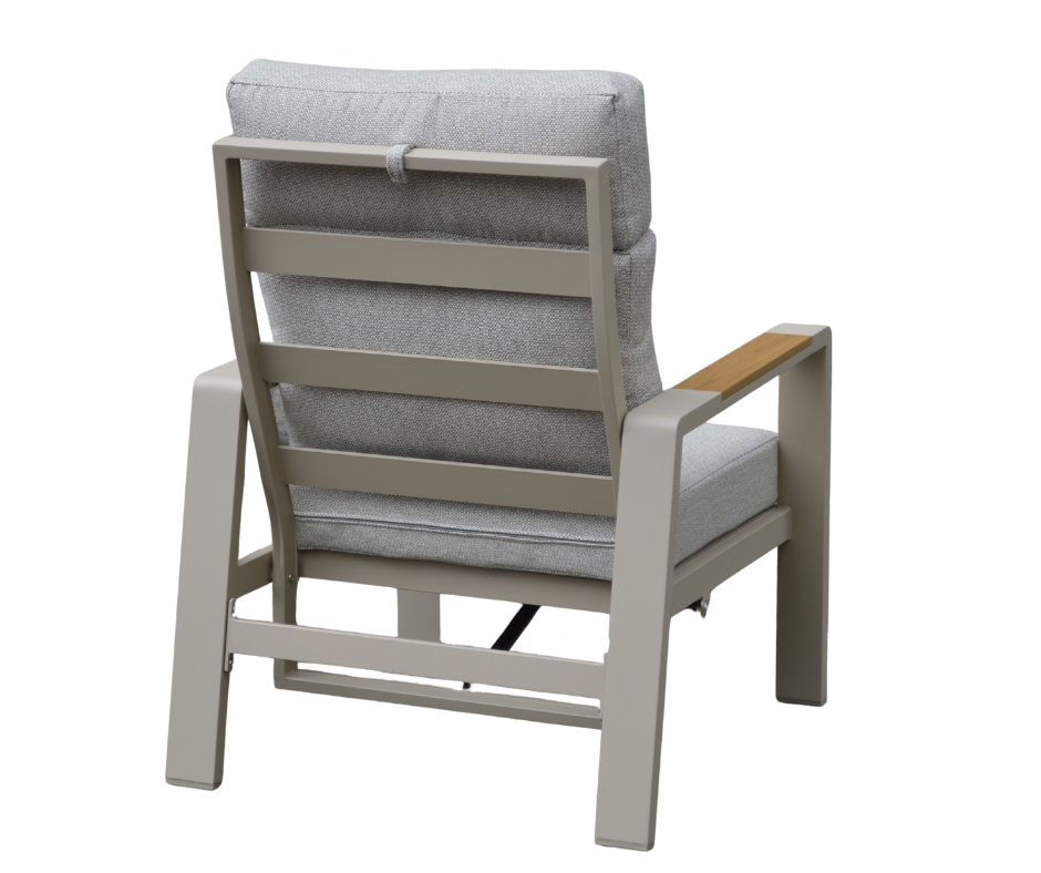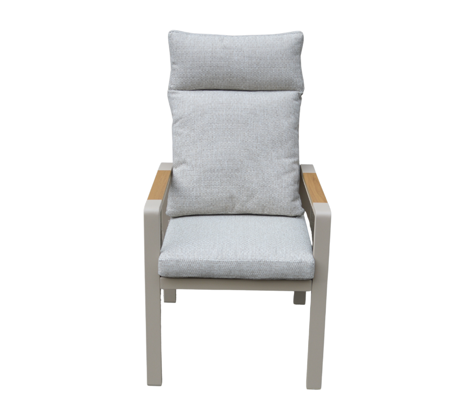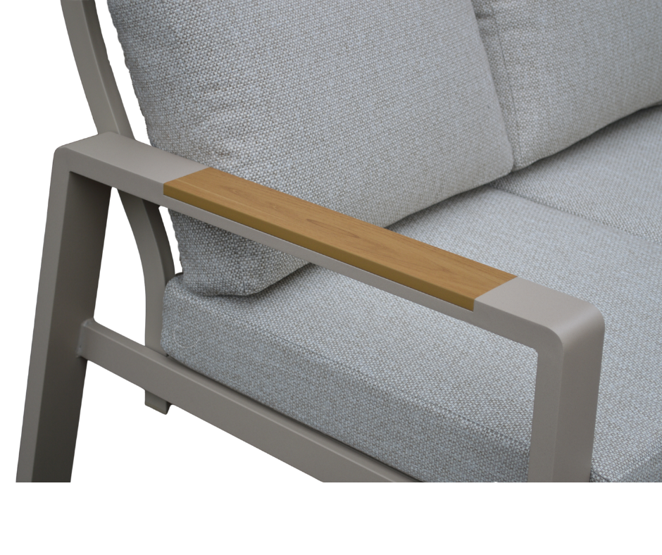De armleuningen en het tafelblad zijn afgewerkt met Polywood, waarmee je de warme houtlook krijgt zónder het onderhoud van echt hout.
