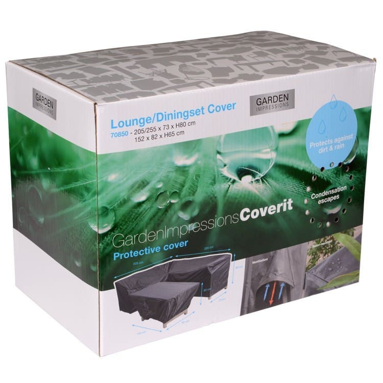 Deze loungedininghoes bestaat uit een hoes voor de bank en voor de tafel. Afmeting zijn 205/255x73xH80 en 152x82xH65 centimeter.