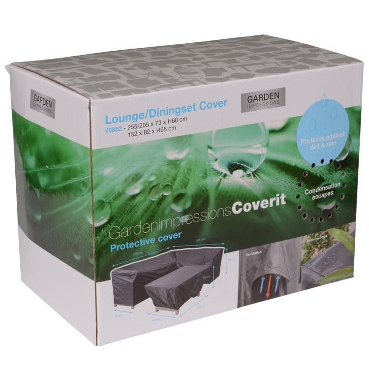 Deze loungedininghoes bestaat uit een hoes voor de bank en voor de tafel. Afmeting zijn 255/205x73xH80 en 152x82xH65 centimeter.