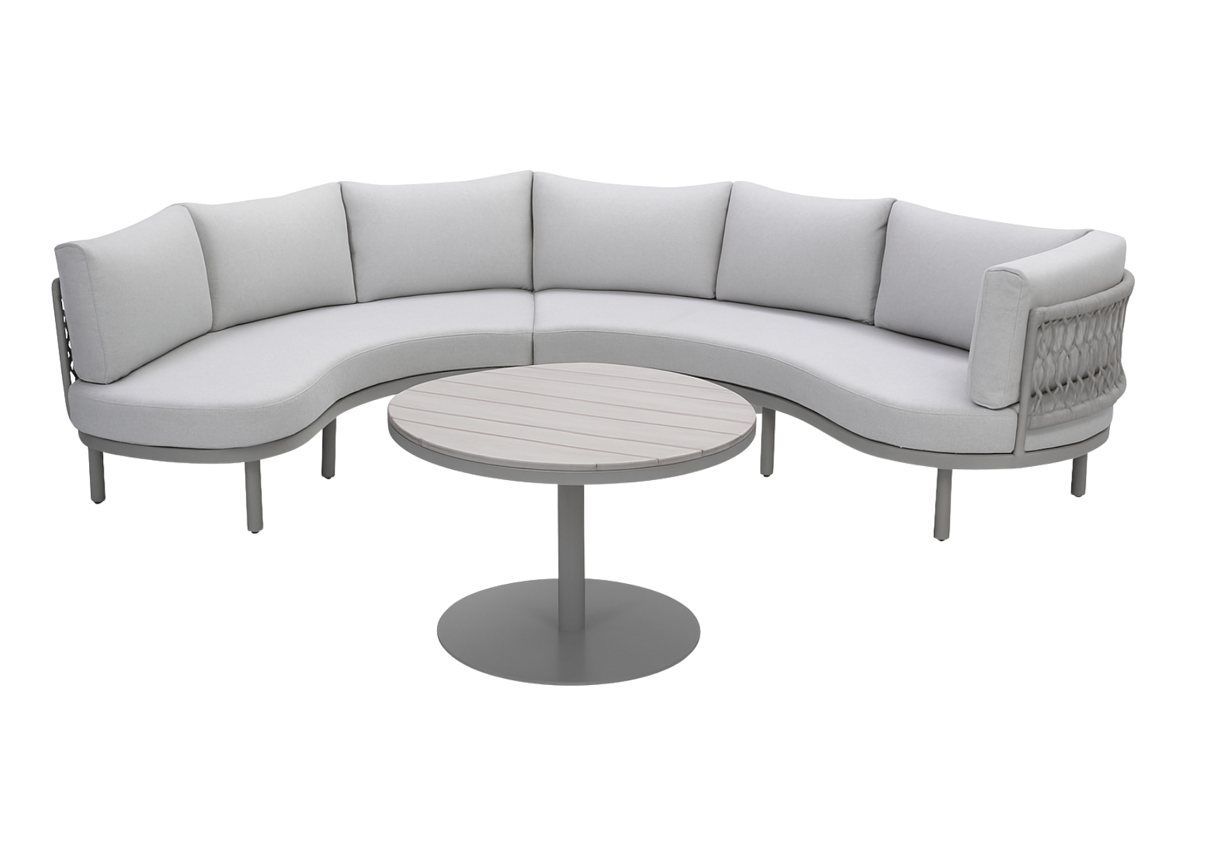 Dankzij de halfronde vorm en de trapezehoek biedt de set veel zitruimte en een optimale indeling van uw buitenruimte. Ideaal om gasten te ontvangen, lange zomeravonden door te brengen of een stijlvolle, functionele loungeplek te creëren.