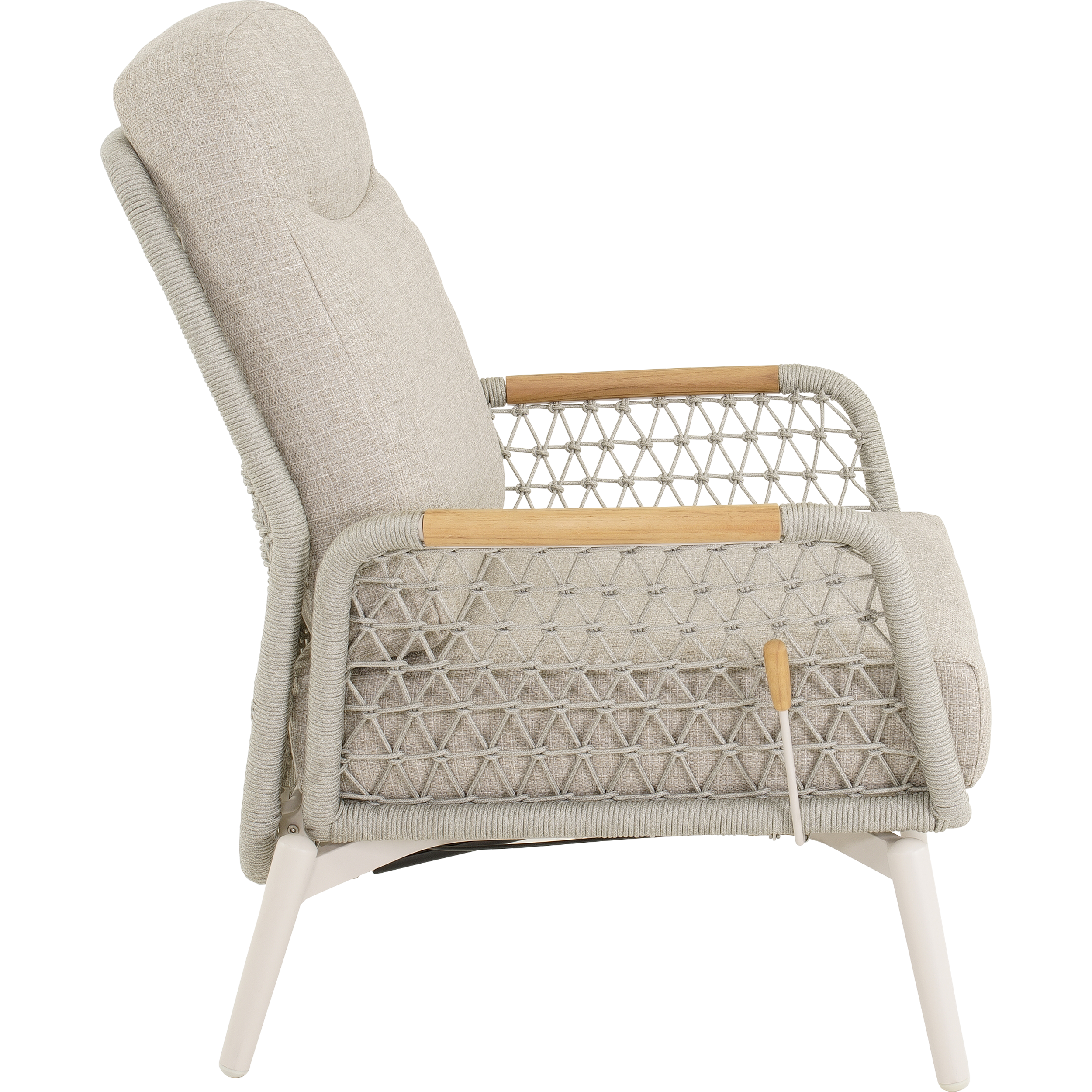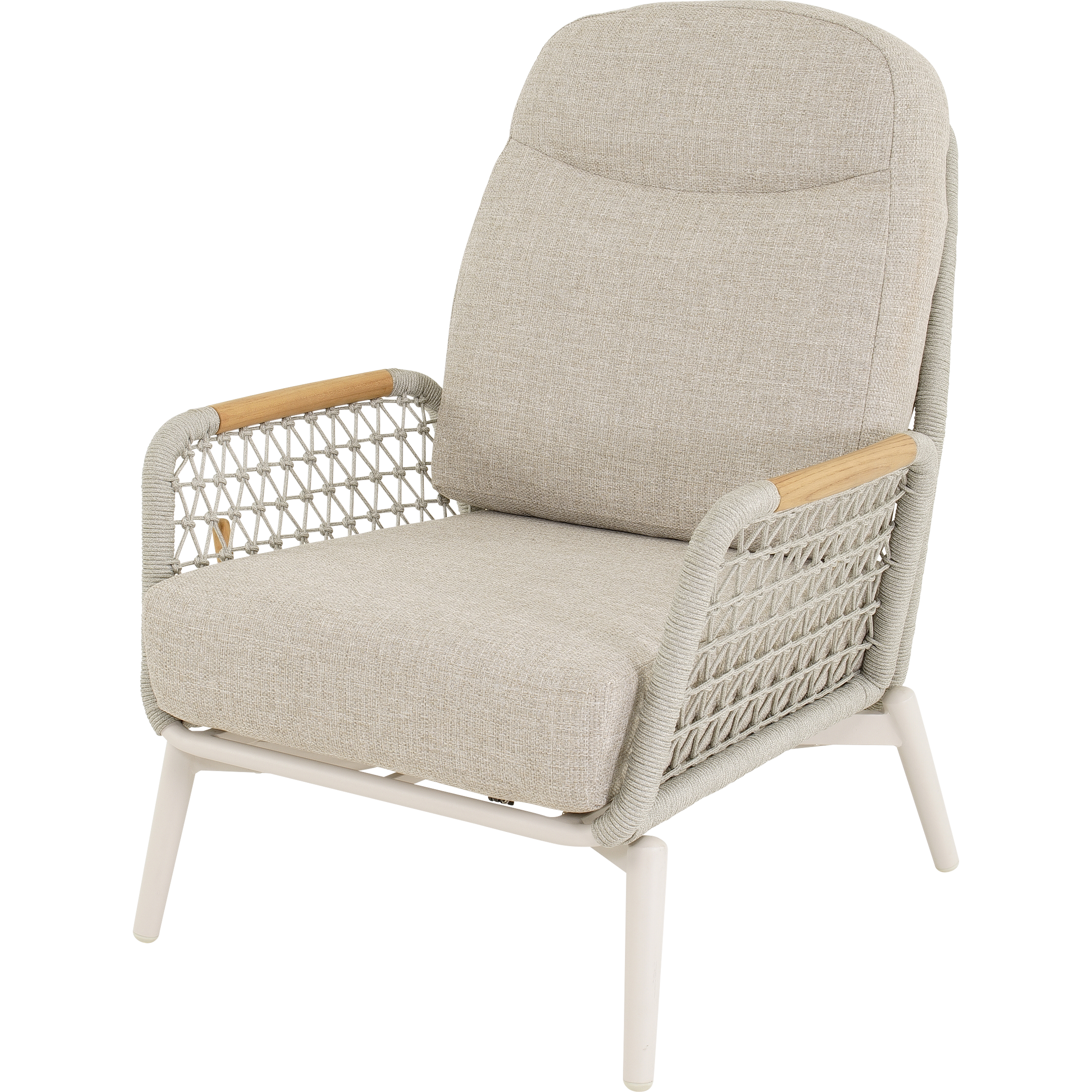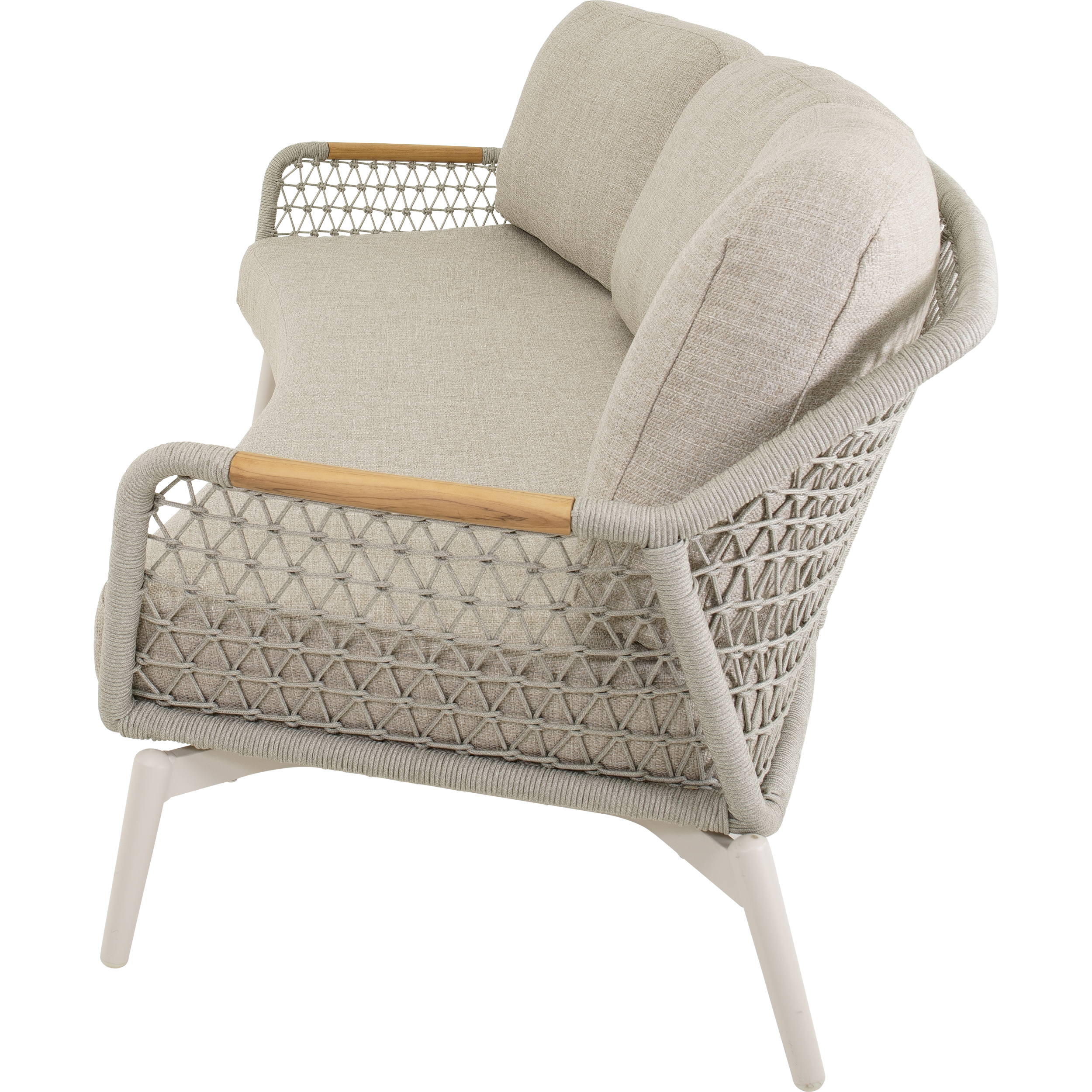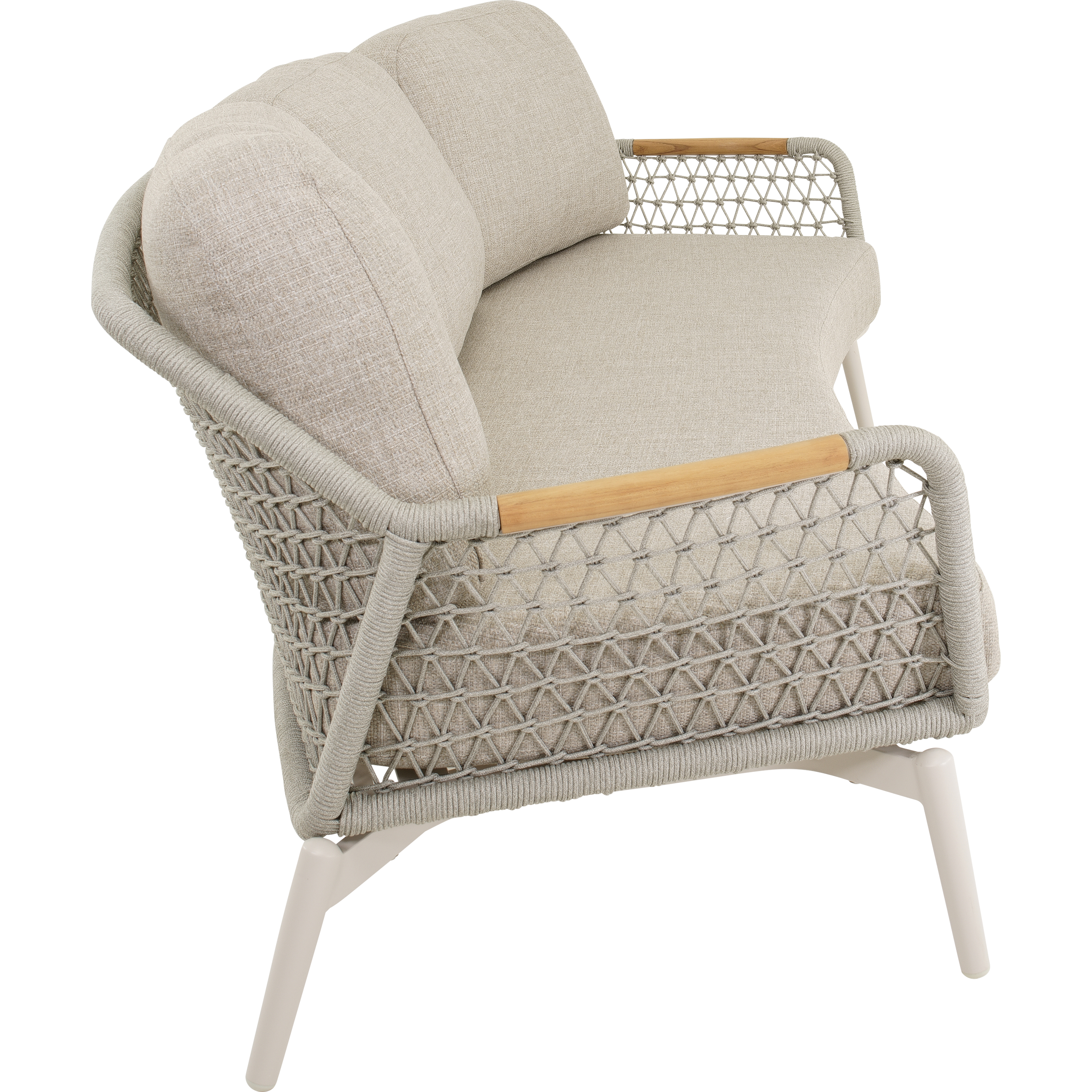 De arm- en rugleuningen zijn afgewerkt met 0,5 cm dik beige rope, wat zorgt voor een luchtige, handgemaakte look en een heerlijk comfortabele zit. De extra dikke 15 cm zit- en rugkussens van hoogwaardig olefin (365 g/m²) in beige geven je het comfort van binnen, maar dan voor buiten.