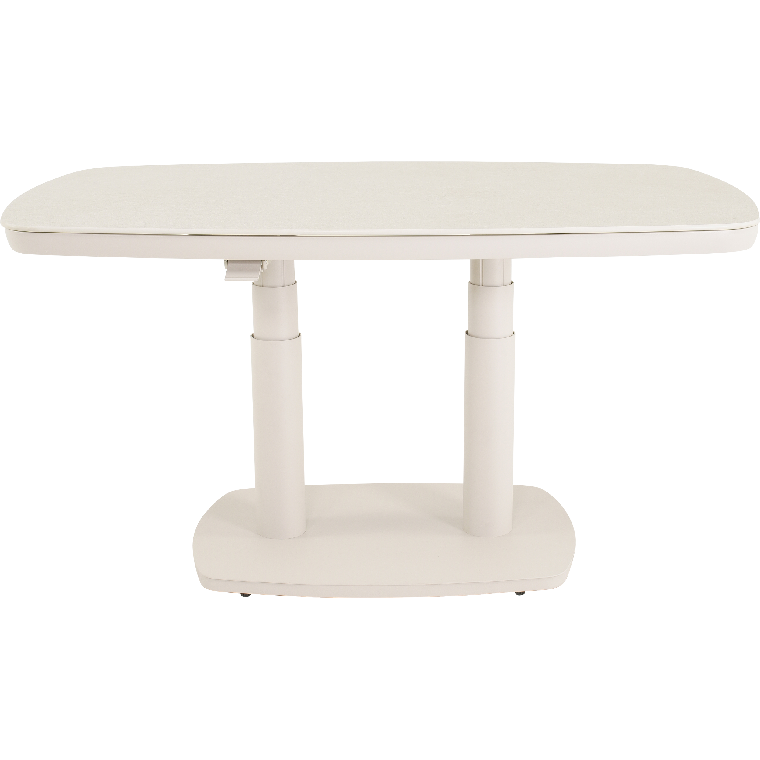 De set wordt compleet gemaakt door de loungetafel in Deens ovaal formaat. Het 0,9 cm dikke sintered stone blad met een beige marmerlook is niet alleen stijlvol en sterk, maar dankzij de in hoogte verstelbare functie (51–71 cm) gebruik je de tafel zowel als loungtafel als eettafel.