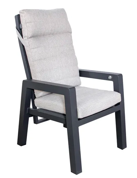 De Santana verstelbare dining stoel is een stijlvolle en comfortabele keuze voor wie graag uitgebreid buiten tafelt. Deze stoel combineert een modern ontwerp met praktisch gebruiksgemak en past moeiteloos in iedere tuin of op elk terras. Het slanke aluminium frame in de kleur Charcoal geeft de stoel een luxe en tijdloze uitstraling, passend bij zowel moderne als klassieke buitenruimtes.