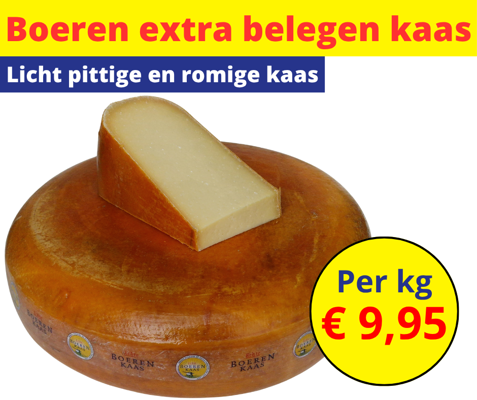 > Spek Verswinkel > Kaas > Boeren extra belegen kaasBoeren extra belegen kaasPer kg€9,95BeschrijvingGerelateerde producten Belegen kaasper kg €9,95 Lees meer 35+ jong belegen kaasPer kilo €13,50 Lees meer Geitenkaasper kg €16,95 Lees meer Witlofper kg €1,95 Lees meer