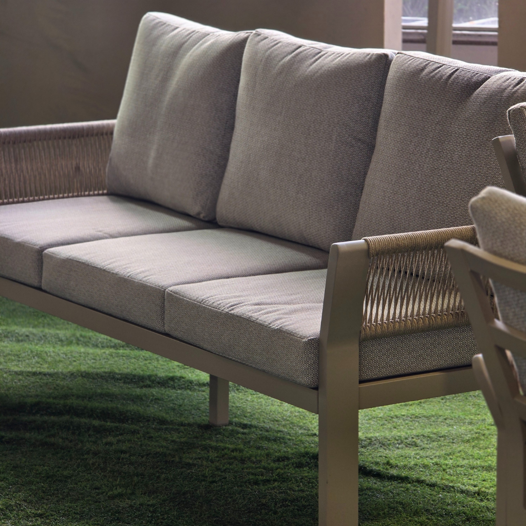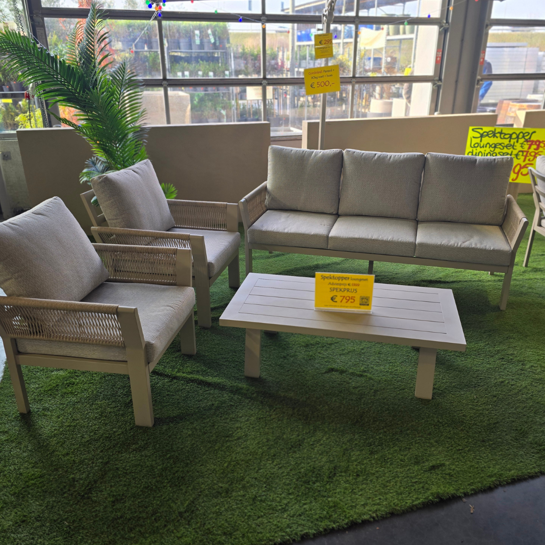 Deze stijlvolle loungeset bestaat uit een 3-zitsbank, een loungetafel en twee loungestoelen.