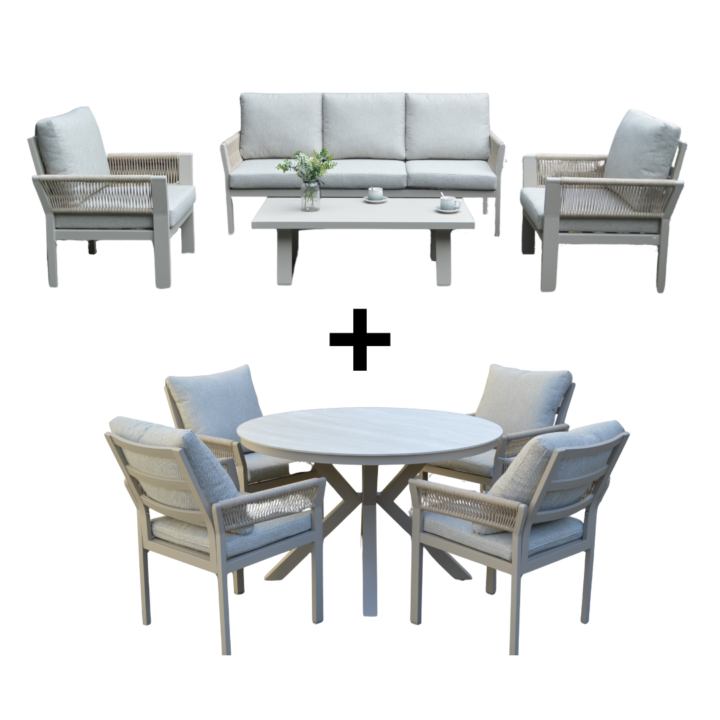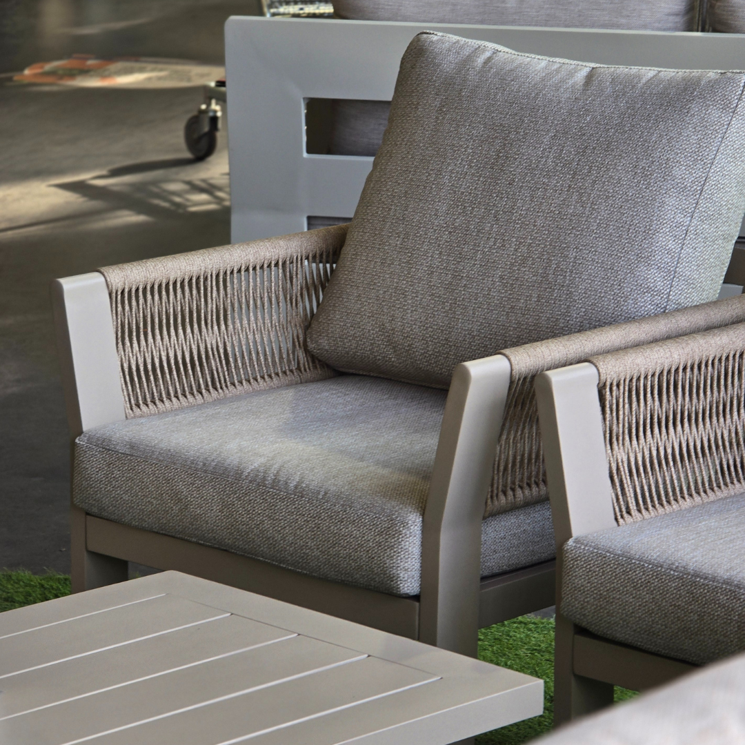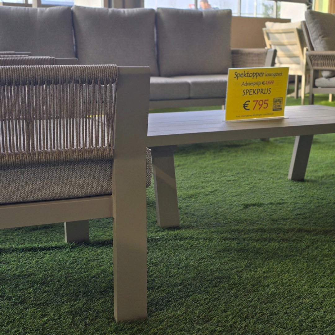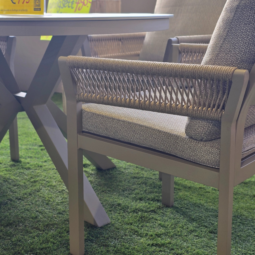 Geniet van stijlvol buiten dineren met deze elegante Spektopper combideal, waarin modern design en hoogwaardige materialen naadloos samenkomen. De stoelen zijn vervaardigd uit een stevig aluminium frame met duurzame poedercoating. Hierdoor zijn ze licht van gewicht, weerbestendig en bijzonder onderhoudsarm. De arm- en rugpartijen zijn afgewerkt met een verfijnde polyester rope weave, wat het geheel een luxe, eigentijdse uitstraling geeft. De meegeleverde kussens zijn waterafstotend (maar laat de kussens niet in de regen liggen) Scoor ze samen voor slechts €1.490 of los voor €795 per set!