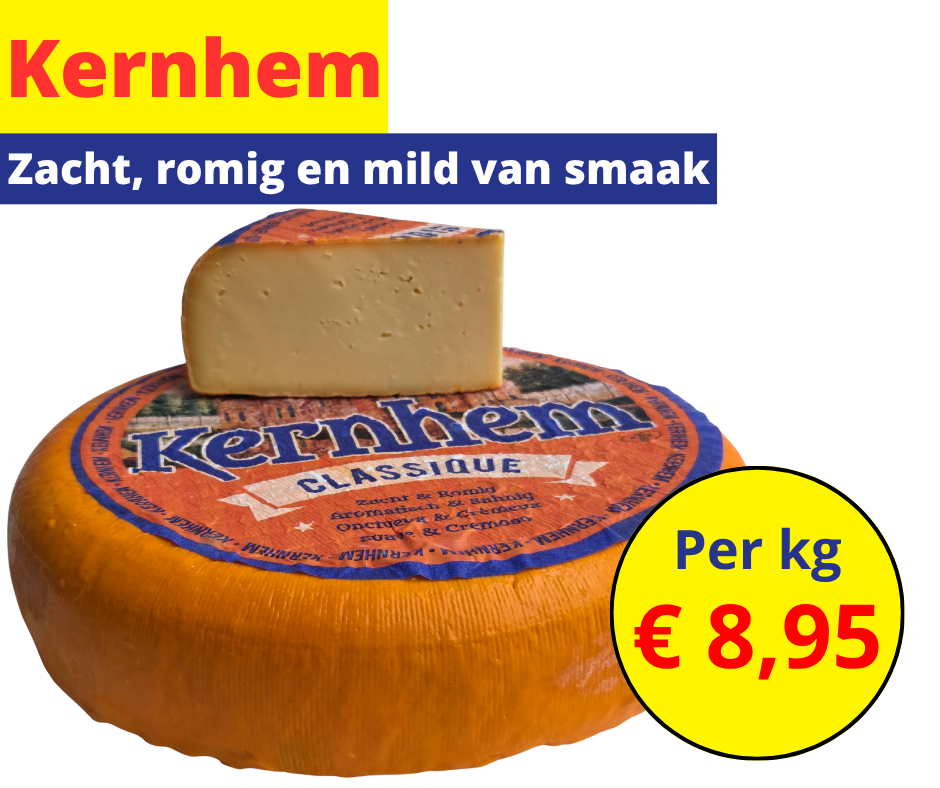 > Spek Verswinkel > Kaas > KernhemKernhemPer kg€8,95BeschrijvingGerelateerde producten Overjarige kaasper kg €14,95 Lees meer 35+ komijnekaasPer kilo €13,95 Lees meer Oude komijnekaasPer kg €12,95 Lees meer SlaPer krop €1,49 Lees meer