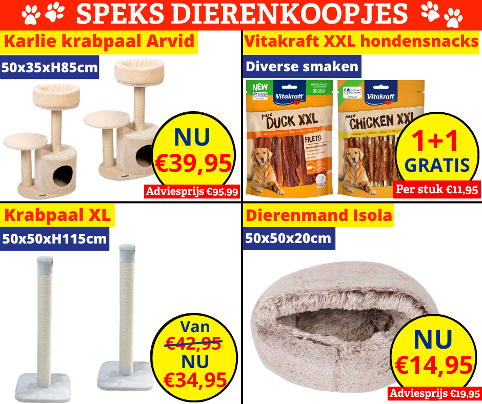 > Tuincentrum > Dierenvoeding & -benodigdheden > Speks dierenkoopjesSpeks dierenkoopjesLekker voordelig!Speks dierenkoopjes Naast deze koopjes vindt u uiteraard nog veel meer voordelige dierenbenodigdheden op onze dierenafdeling!BeschrijvingGerelateerde producten Royal Canin hondenvoerDiverse soorten Lees meer
