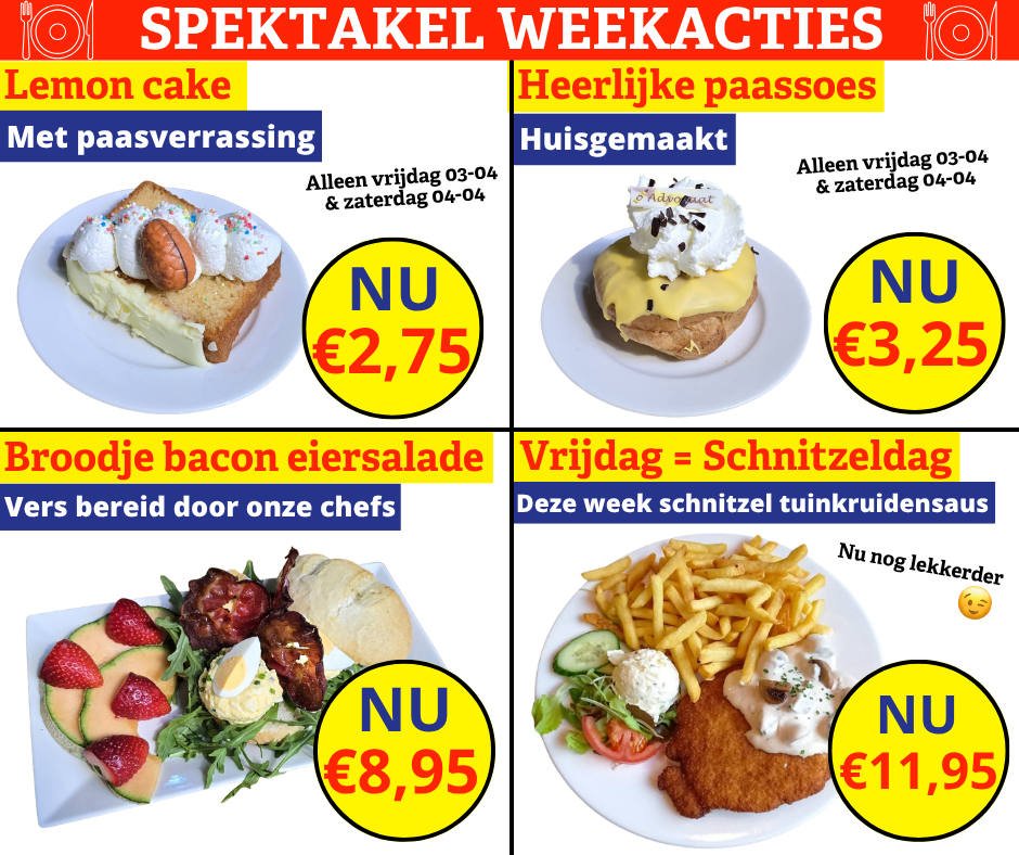 > Horeca > Spektakel weekactiesSpektakel weekactiesVanaf€2,75Spektakel weekacties Lemon cake met paasverrassing | NU €2,75 Huisgemaakte paassoes | NU €3,25 Broodje bacon eiersalade | NU €8,95 Vrijdag = Schnitzeldag | Deze week schnitzel tuinkruidensaus | NU €11,95BeschrijvingGerelateerde producten Horeca Lees meer Happy SpekkyNU €4,95 Lees meer