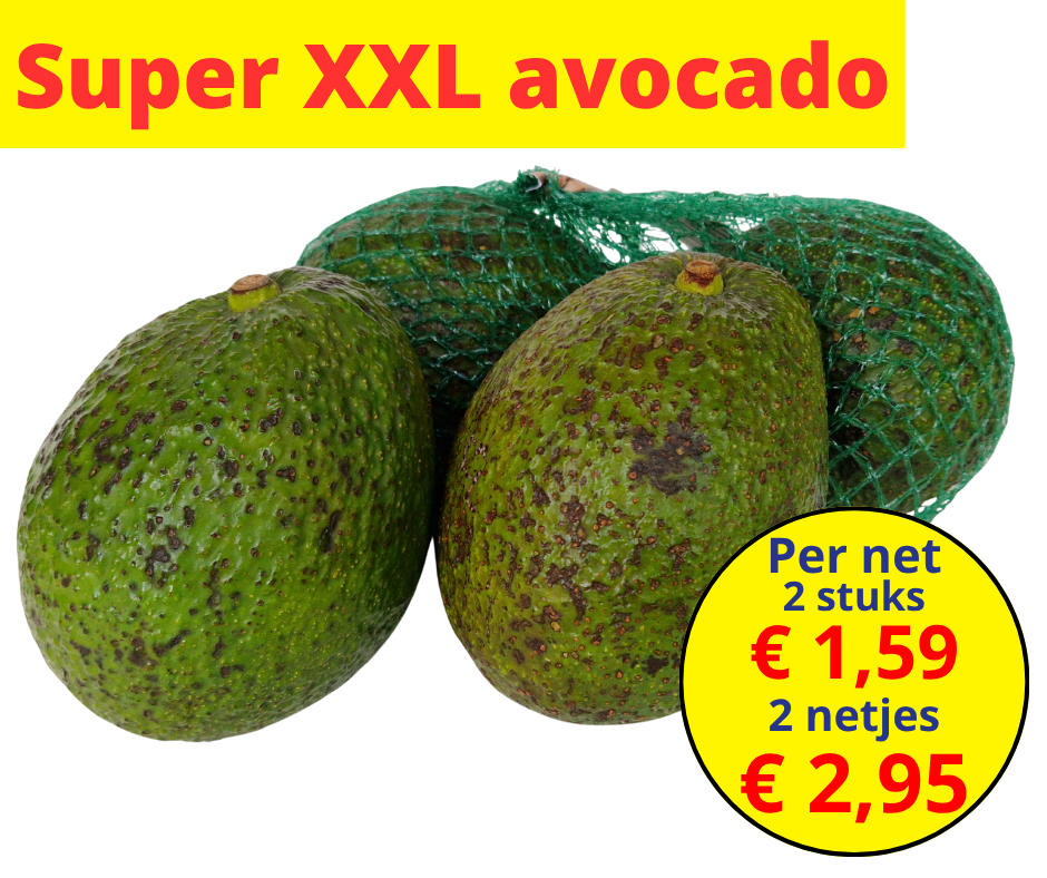 > Spek Verswinkel > Groenten > Super XXL avocadoSuper XXL avocado2 netjes voor€2,95BeschrijvingGerelateerde producten Andijvieper kg €1,95 Lees meer WinterpeenPer kg €0,89 Lees meer SlaPer krop €1,49 Lees meer Sperziebonenper kilo €3,95 Lees meer