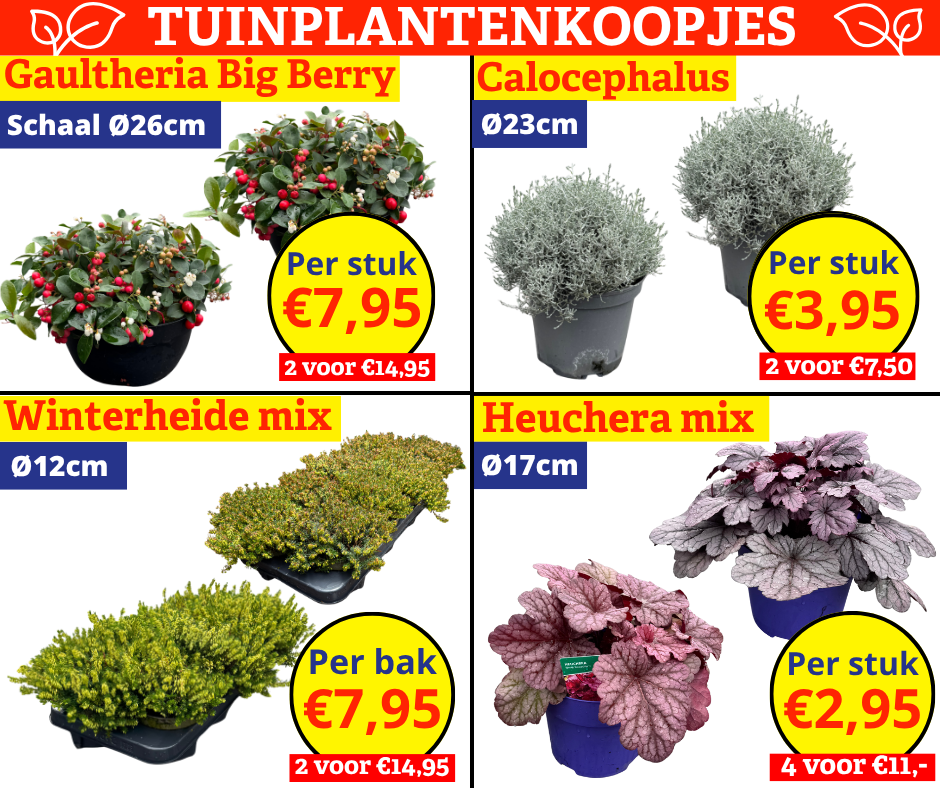 > Tuincentrum > Planten > Tuinplanten > TuinplantenkoopjesTuinplantenkoopjesVanaf€2,95Tuinplantenkoopjes Naast al deze leuke koopjes vindt u in ons tuincentrum uiteraard nog veel meer prachtige tuinplanten voor leuke prijsjes!BeschrijvingGerelateerde producten Prunus dom. Opal laagstam €15,95 Lees meer Prunus avium Regina laagstam €15,95 Lees meer Prunus avium Stella laagstam €15,95 Lees meer Patio Fruitbomen €14,95 Lees meer