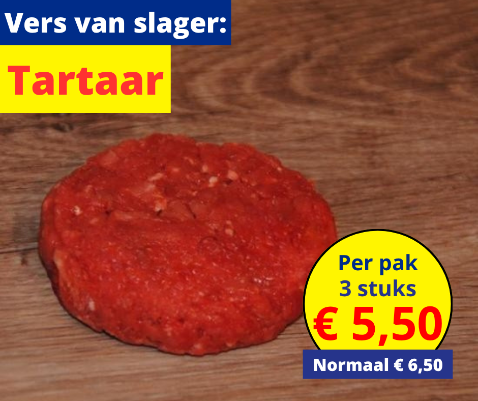 > Spek Verswinkel > Vers overig > Vers van de slager: Tartaar15%Korting Vers van de slager: TartaarNu per pak 3 stuks€6,50 Oorspronkelijke prijs was: €6,50.€5,50Huidige prijs is: €5,50.BeschrijvingGerelateerde producten Andijvieper kg €1,95 Lees meer BildtstarPer zak 5 kilo €2,95 Lees meer Jong belegen kaasper kg €9,50 Lees meer Extra belegen kaasPer kg €9,95 Lees meer